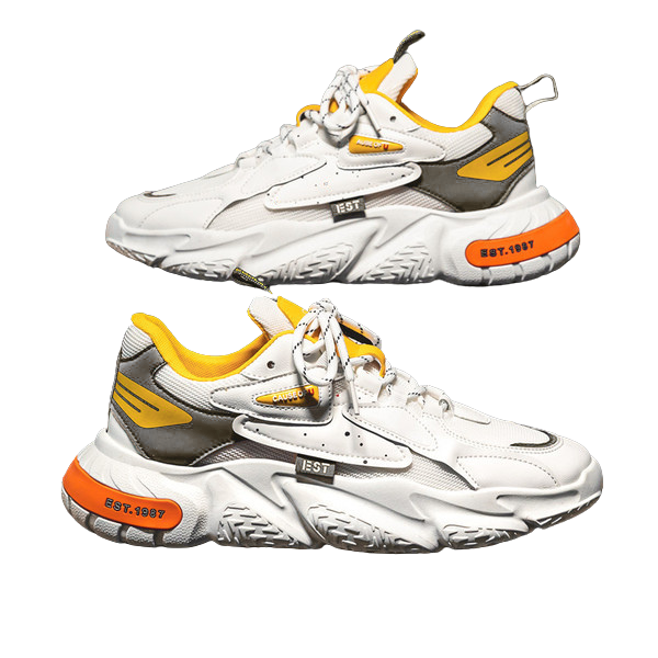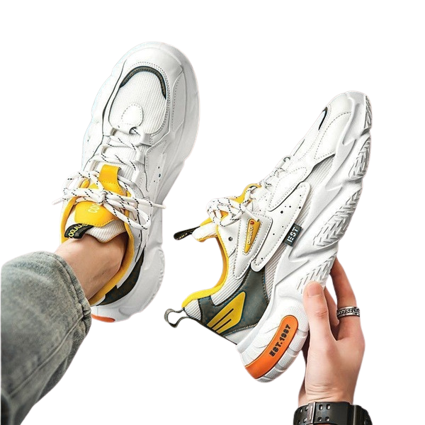 • Contemporary Design: The shoe features a dynamic, multi-textured design with contrasting pops of colour (like the signature yellow and orange accents shown in the image) that make a statement. They perfectly capture the “dad shoe” trend but refine it with sleek lines and high-quality materials.